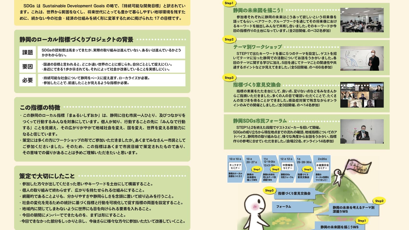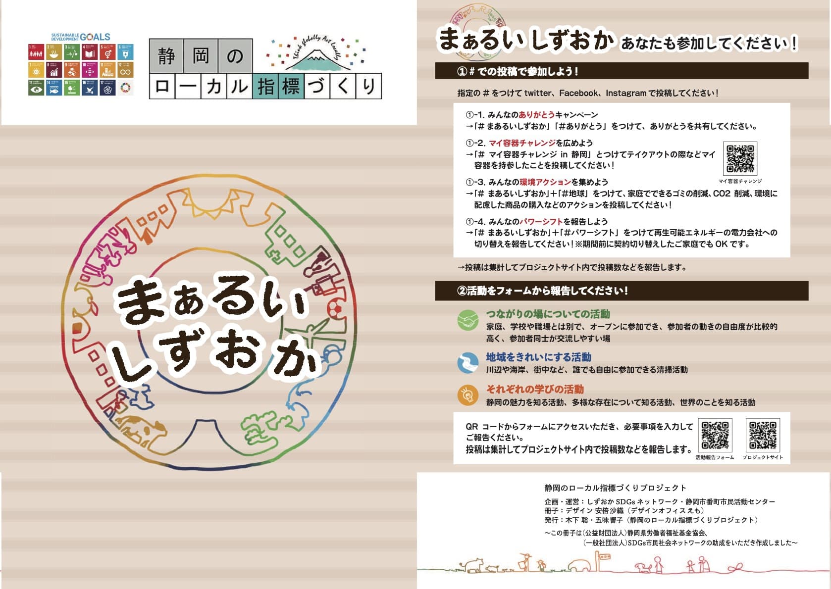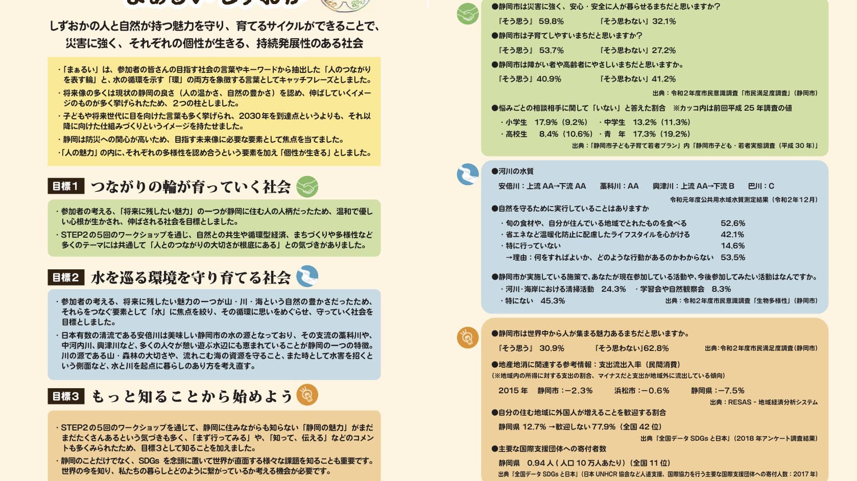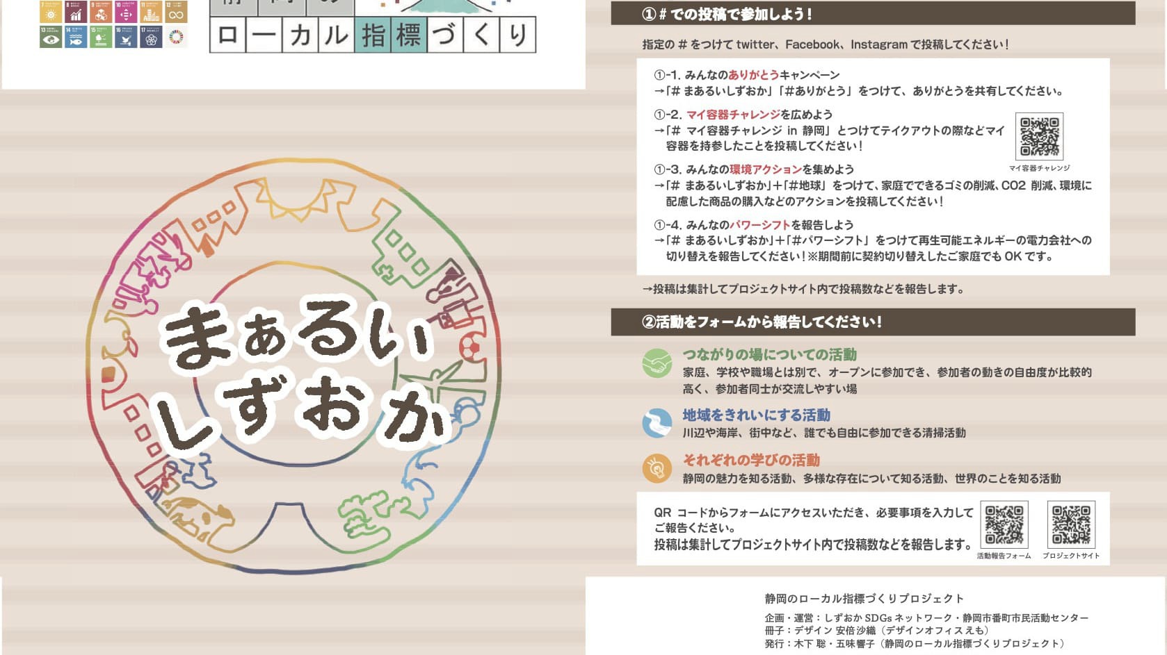 このプロジェクトは、SDGsをローカライズする試みとして2020年10月~2021年2月にわたって市民参加のワークショップを繰り返し、「まぁるいしずおか」というローカル指標を策定しました。このページではその内容をお伝えし、それに基づく市民の皆さんの取り組みを可視化していきます。