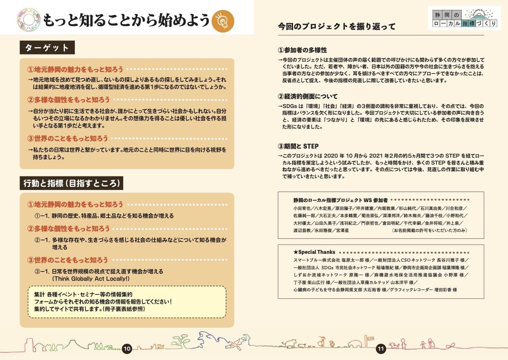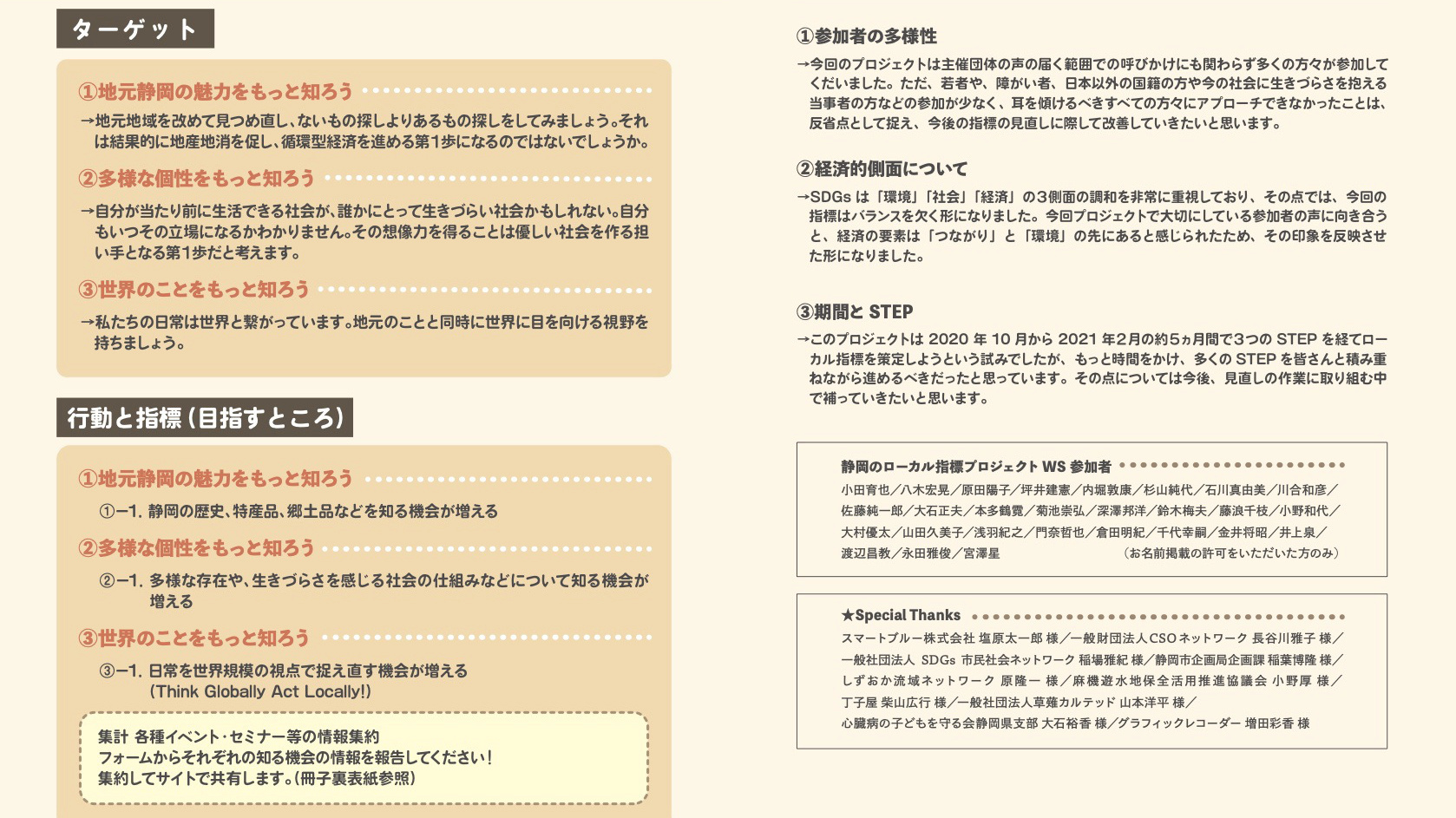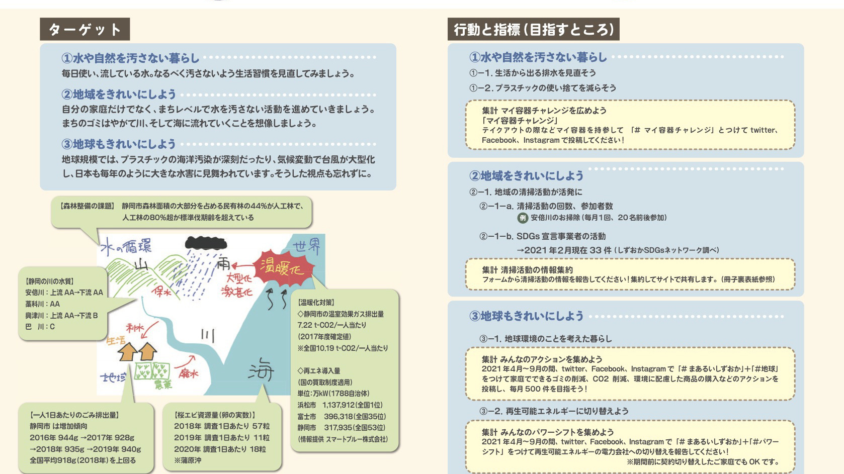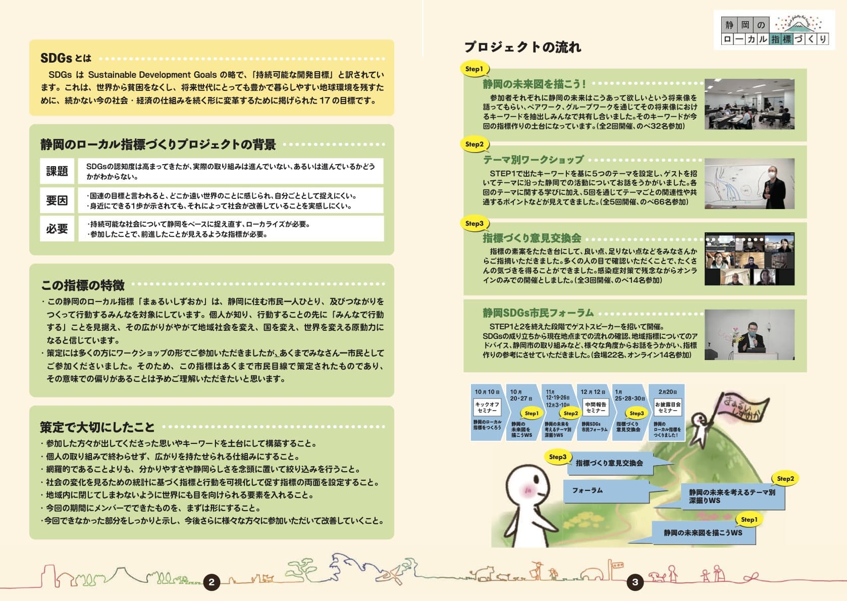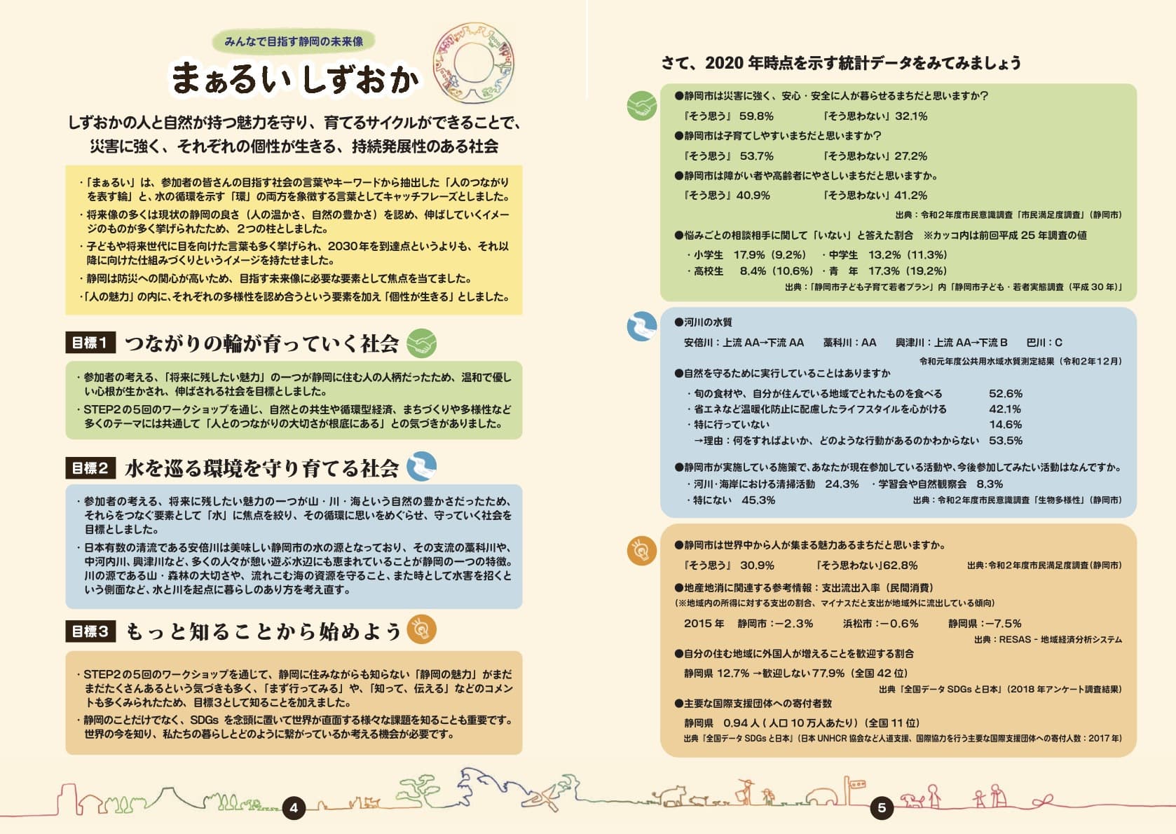 このプロジェクトは、SDGsをローカライズする試みとして2020年10月~2021年2月にわたって市民参加のワークショップを繰り返し、「まぁるいしずおか」というローカル指標を策定しました。このページではその内容をお伝えし、それに基づく市民の皆さんの取り組みを可視化していきます。